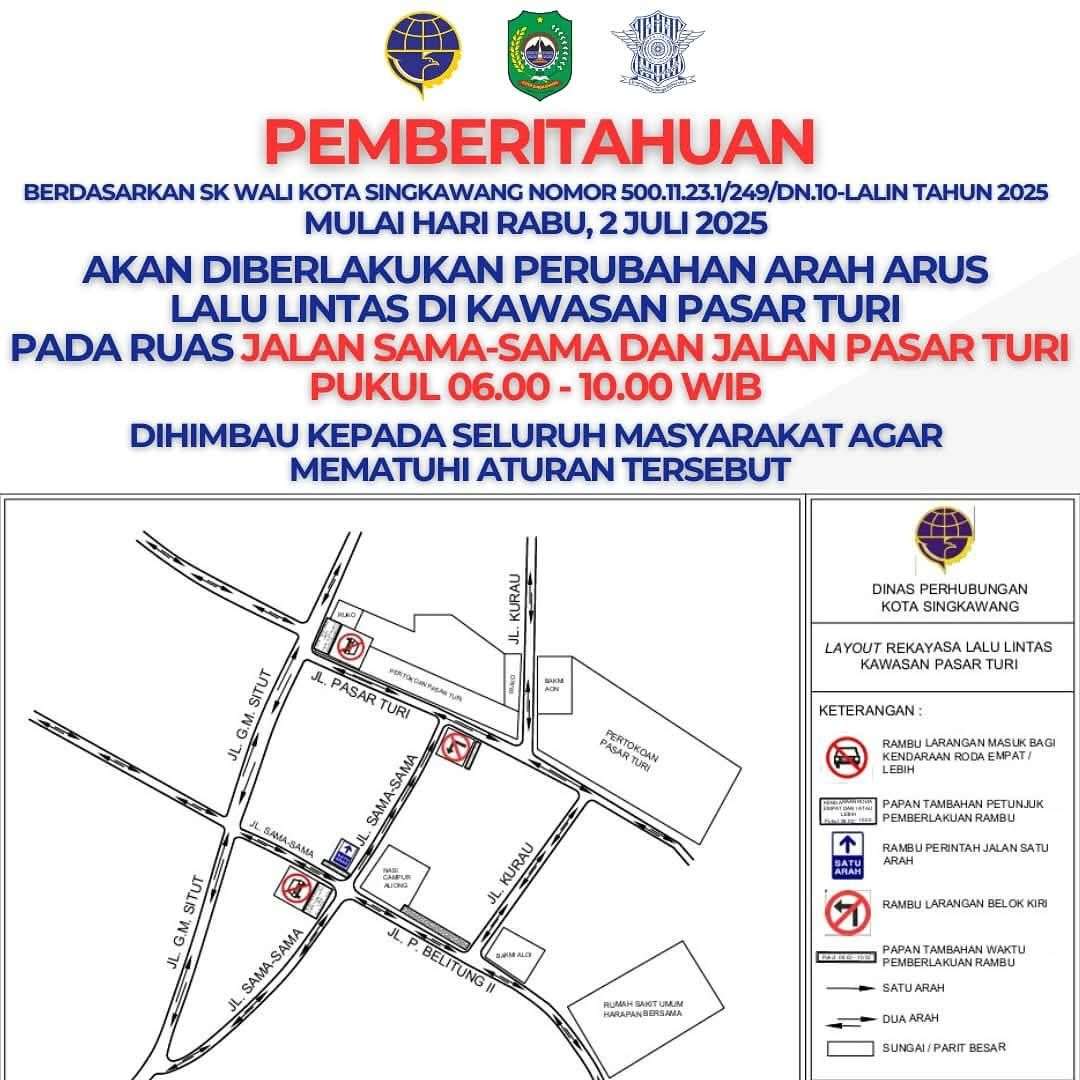 “Untuk warga Singkawang, mulai 6 Juni telah diberlakukan perubahan arah arus lalu lintas dengan sistem satu arah atau one way di ruas Jalan Sama-Sama dan Jalan Pasar Turi,” ucap Kepala Dinas Perhubungan Kota Singkawang, Eko Susanto. Rabu (2/7/2025).