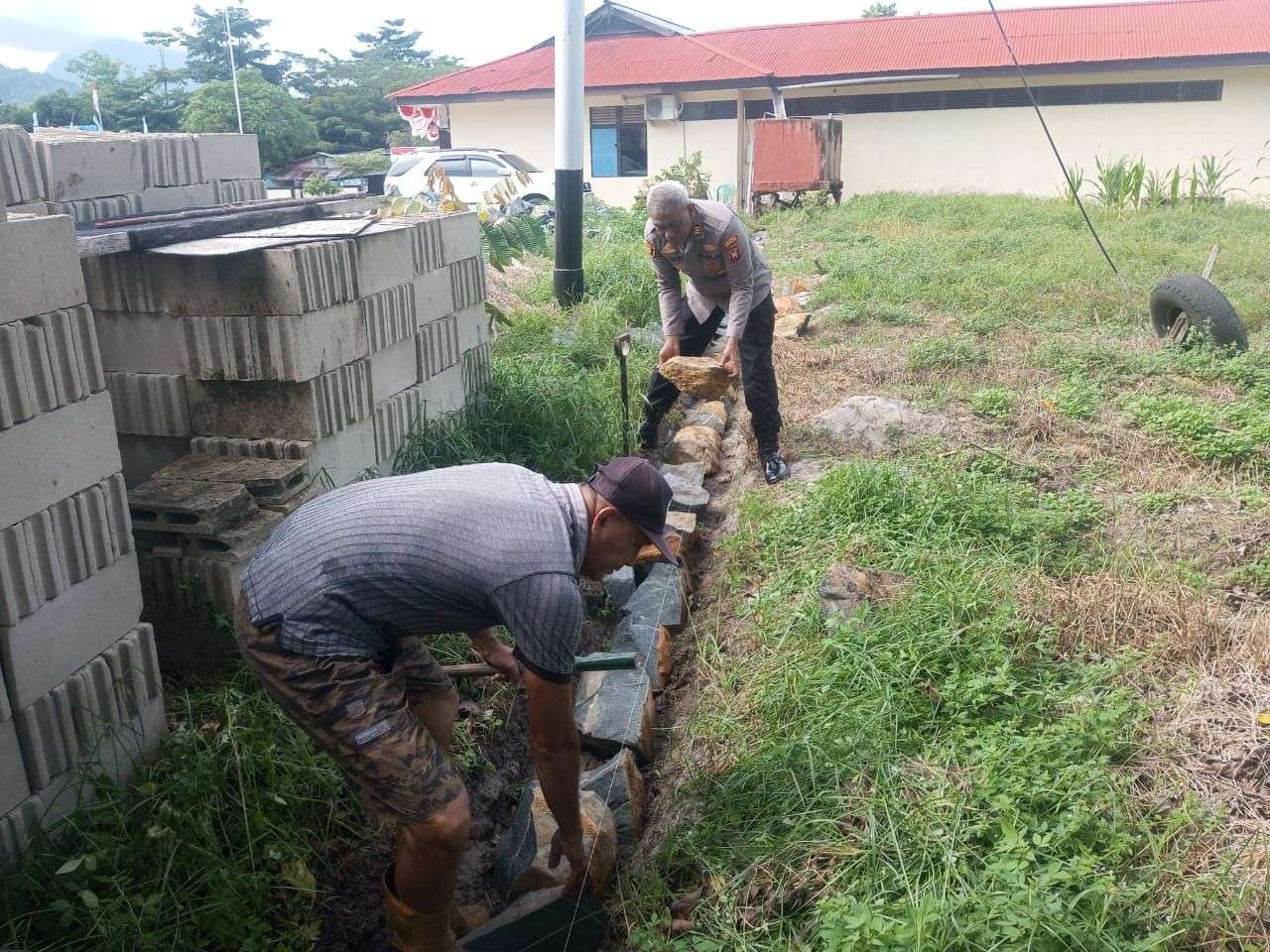 Dengan seragam pakaian dinas lapangan tidak membuat pak walidu canggung melakukan aktivitas pembangunan pagar kantor polsek tersebut.