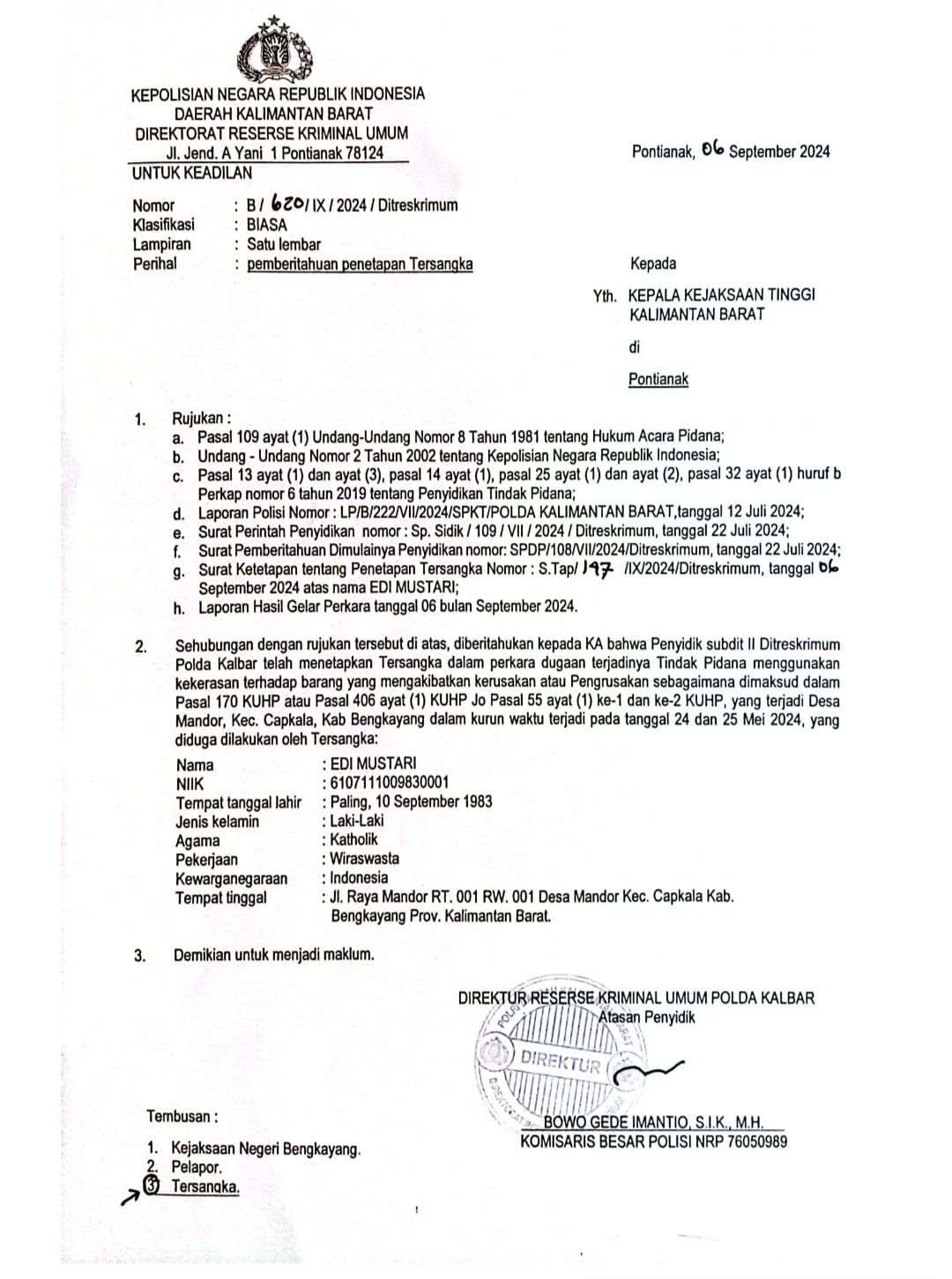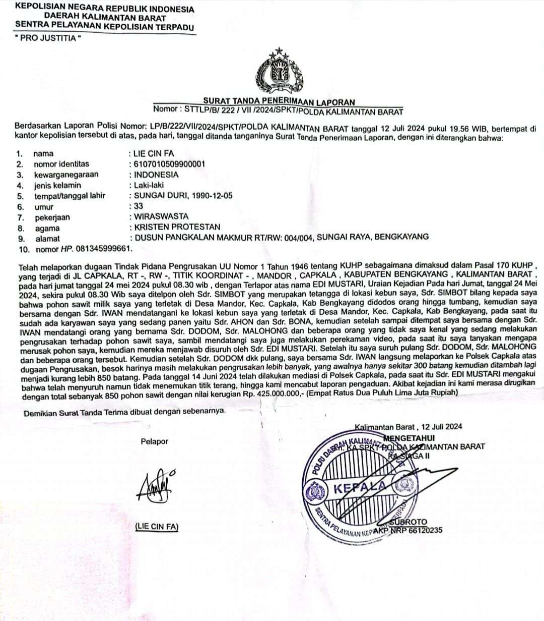 “Apalagi di sini ada dugaan pelanggaran hukum yang mana telah terjadi pengrusakan -+ 850 btg pohon sawit dan pohon pinang milik Lie Cin Fa, yang sedang berjalan kasusnya dan sudah ditetapkan tersangka oleh penyidik Direskrimum Polda Kalbar dengan perkara berdasarkan Surat Pemberitahuan Penetapan Tersangka dalam perkara dugaan terjadinya tindak Pidana menggunakan kekerasan terhadap barang yang mengakibatkan kerusakan atau pengerusakan sebagaimana dimaksud dalam Pasal 170 KUHP atau Pasal 406 ayat (1) KUHP Jo Pasal 55 ayat (1) ke-1 dan ke-2 KUHP, dengan Nomor: B/620/IX/2024/Ditreskrimum Polda Kal-Bar pada September 2024,” ucapnya.