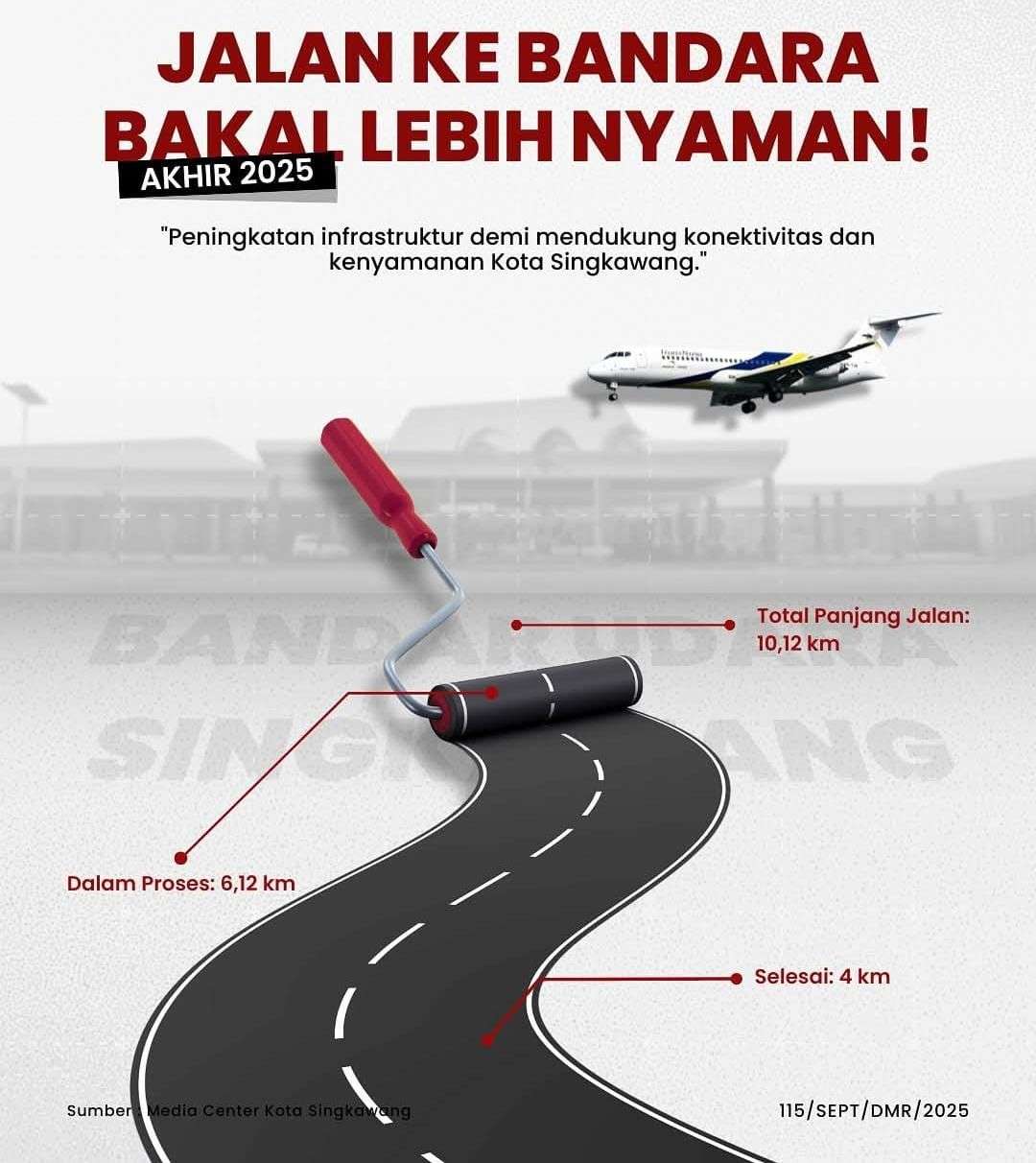 Pembangunan jalan menuju Bandara Singkawang terus dikebut. Dari total 10,12 km, saat ini sudah 4 km selesai dan 6,12 km masih dalam proses.