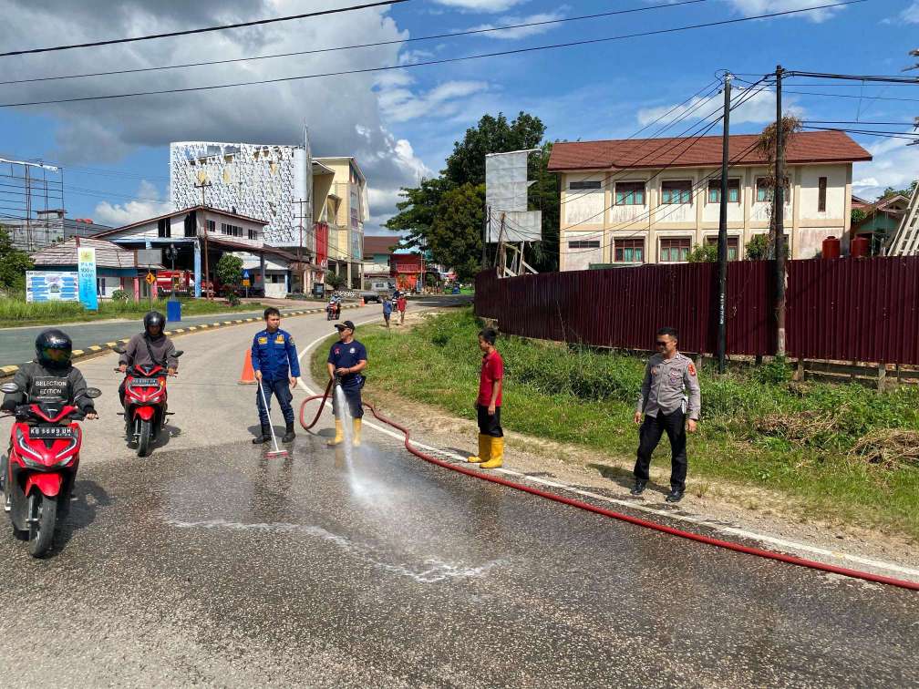 Kapolres Sekadau AKBP I Nyoman Sudama, melalui Kasi Humas AKP Agus Junaidi, menyampaikan bahwa personel Pos Yan yang terdiri dari anggota Polri dan petugas Dinas Pemadam Kebakaran (Damkar) segera bergerak setelah menerima laporan adanya tumpahan solar yang berpotensi membahayakan pengguna jalan.