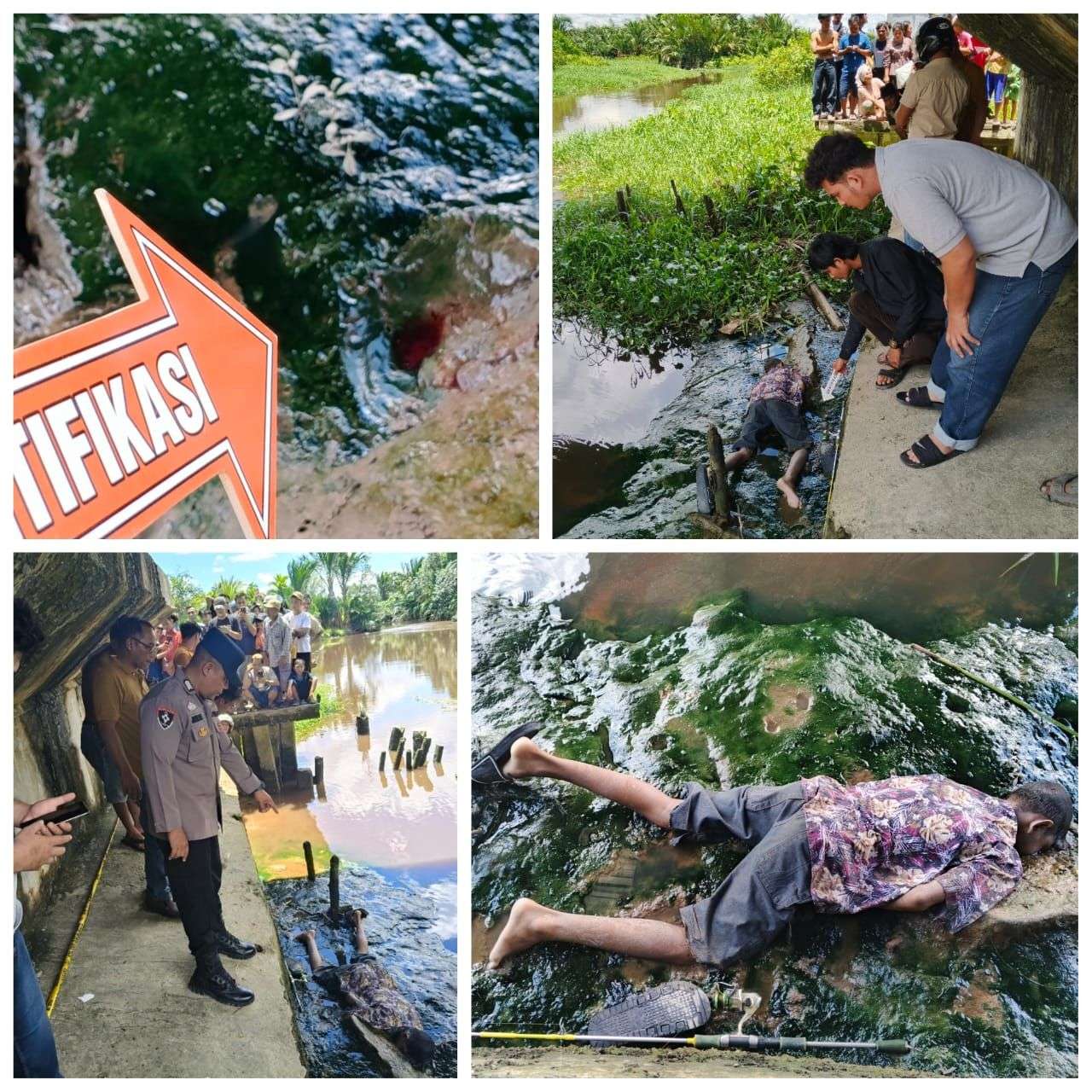 Saat ditemukan, korban berada dalam kondisi meninggal dunia dengan posisi telungkup, mengenakan baju motif bunga dan celana jeans pendek warna hitam, serta sebuah alat pancing yang berada di samping tubuhnya.